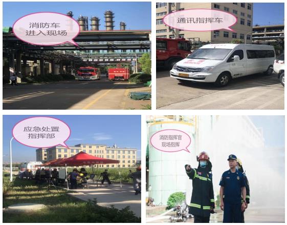 火灾事故模拟公司十车间精馏生产装置发生火情。公司的现场人员发现后及时进行初期火灾灭火并报告给公司,公司领导根据事故情况启动公司应急救援预案。在公司工艺处置队和消防救援队进行现场处置无法控制火情的状况下及时拨打119消防救援电话。衢州消防柯山大队接警后迅速组织力量,出动消防官兵60余人,各类型消防救援车12台,配套各类消防救援物资,现场设置灭火作战指挥部,联动园区专家工艺处置队、巨化专职队、华友专职队、中天专职队赶赴现场救援。