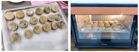 制作完成的月饼统一由老师放进烤箱进行烘焙,不一会儿,一个个精美的月饼就完美呈现啦,大家在月饼香味四溢中感受传统节日气氛。