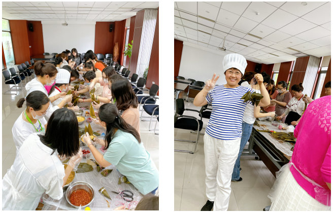 大家兴致勃勃地围在一起包起了粽子,互相交流着包粽子的技巧。在老师的指导下,将两条粽叶平摊在手掌中,交压着铺平后再对折,折成一个尖角漏斗的形状,尖角处稍微重叠一点点,避免漏米,再放入猪肉或红枣等…大家开始折粽叶、填糯米、压紧实、封口、扎捆,巧手翻飞,转眼间,一个个粽子瞬间成型。很多同事表示“粽子经常吃,但却从未自己动手包过。”